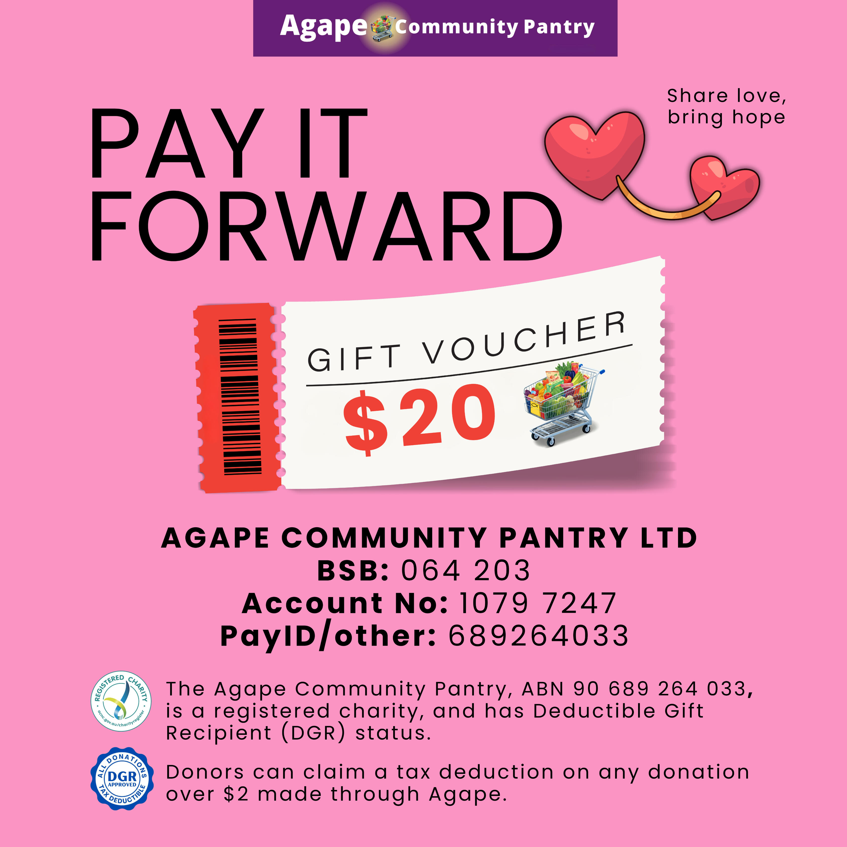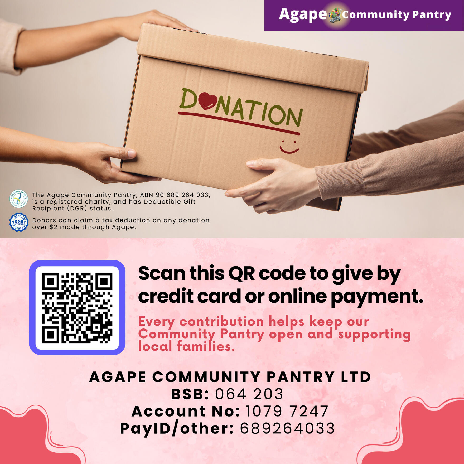 We are more than a church, we are a family committed to making a difference. The Agape Community Pantry is a faith-based initiative hosted by Kingdom Church. We offer low-cost groceries and essential household items to the local community.Through outreach, partnerships, and acts of service, we aim to meet community needs and show Christ’s love in action.The Agape Community Pantry, in collaboration with Foodbank Australia, welcomes everyone in need. For the latest updates on available fresh produce and pantry items, please visit our Facebook page.Agape Community Pantry Donations: