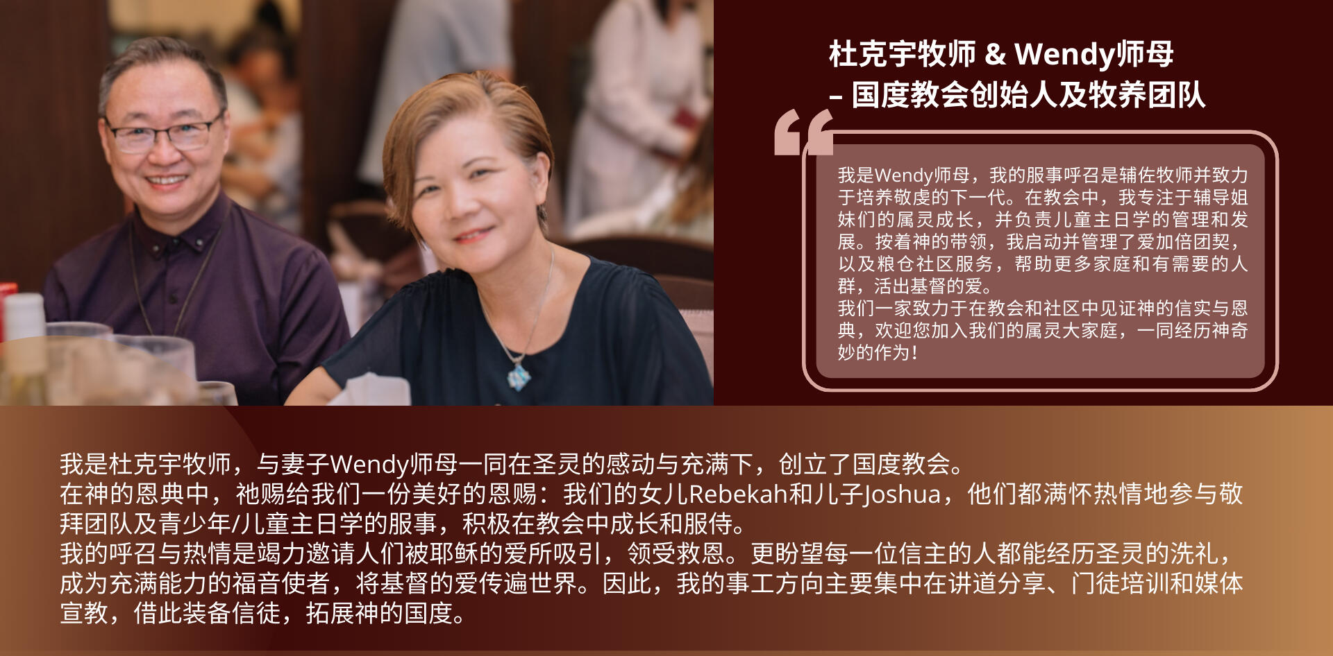 Shane 杜牧师是国度教会的创始人及主任牧师。在蒙召进入全职事奉前,杜牧师曾是一位享誉国际的知名舞者,舞蹈生涯逾十五年,屡获中国国家级荣誉,并在全球范围内斩获多项殊荣。1990年,他因追寻个人梦想而踏上澳大利亚的土地,直至一次深刻的神圣相遇彻底改变了他的人生轨迹。回应神的呼召,他在圣灵的引导下创立了这间充满活力、洋溢圣灵同在的教会,旨在积极影响布里斯班的华人教会及更广泛的地方社区。如今,他仍以满腔热忱与坚定承诺,引领教会前行,继续服事神的百姓。