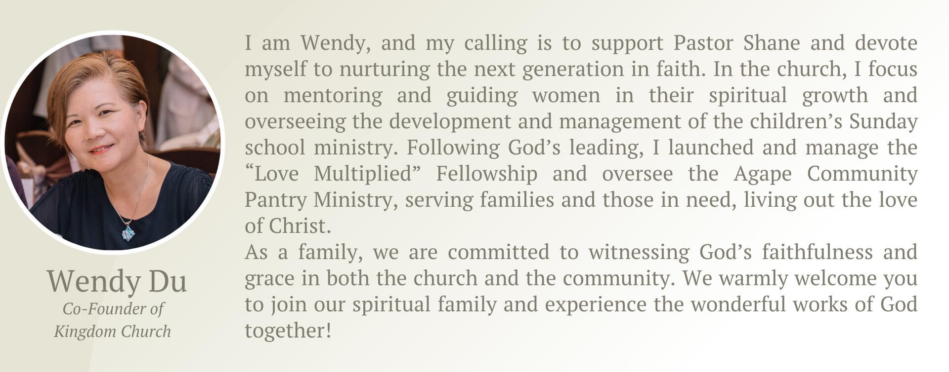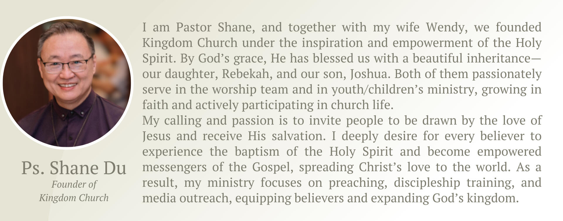 Shane Du, the Senior Pastor and founder of Kingdom Church, brings a powerful testimony of transformation and faith. Before stepping into ministry, Shane was a renowned and successful dancer, recognized by Chinese national institutions and honored with prestigious awards worldwide throughout his 15-year career.In 1990, his journey led him to Australia in pursuit of personal aspirations. However, a profound encounter with God redirected his life’s path, leading him to embrace his calling in ministry. Answering God’s call, Shane founded Kingdom Church, a vibrant, Holy Spirit-filled community with a mission to make a lasting impact on both the Chinese churches in Brisbane and the wider local community.Pastor Shane continues to lead and serve with passion and commitment, dedicating his life to spreading the message of Christ and fostering spiritual growth within the church.